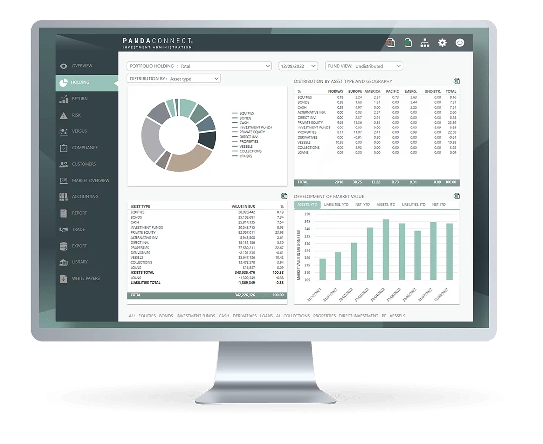 The Swimbird Platform (SWIP) is a portfolio management solution offering users a holistic view of their entire portfolio. SWIP aggregates and visualises portfolio data, including assets and liabilities – all in real time. It can manage all financial instruments (listed and OTC), private equity, and alternative investments.