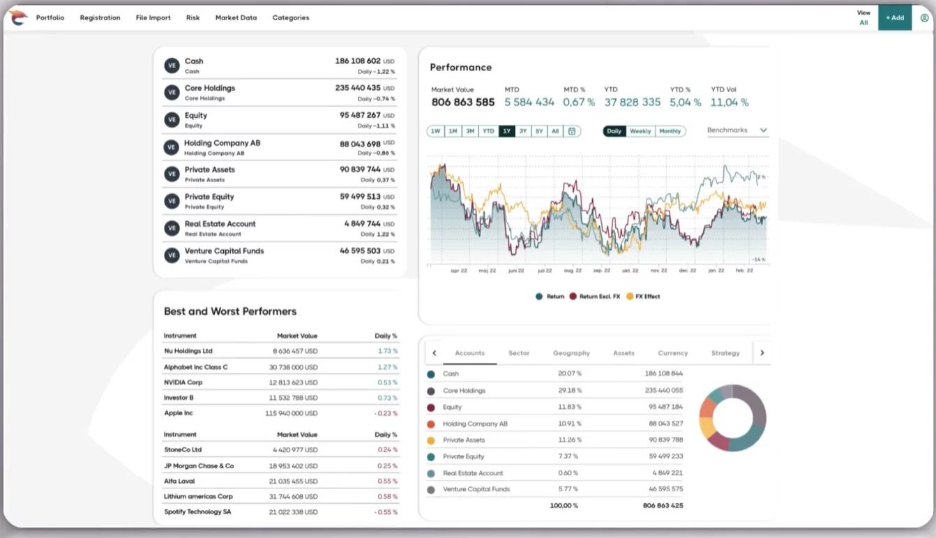 Intelligent family office suite solutions are purpose-built for family offices seeking comprehensive investment management capabilities beyond basic portfolio tracking. These platforms offer advanced investment data aggregation, automated reconciliation, and sophisticated analytics. Unlike generic wealth management tools, they provide family office professionals with reporting, multi-asset portfolios support, and specialized features for managing wealth across generations.