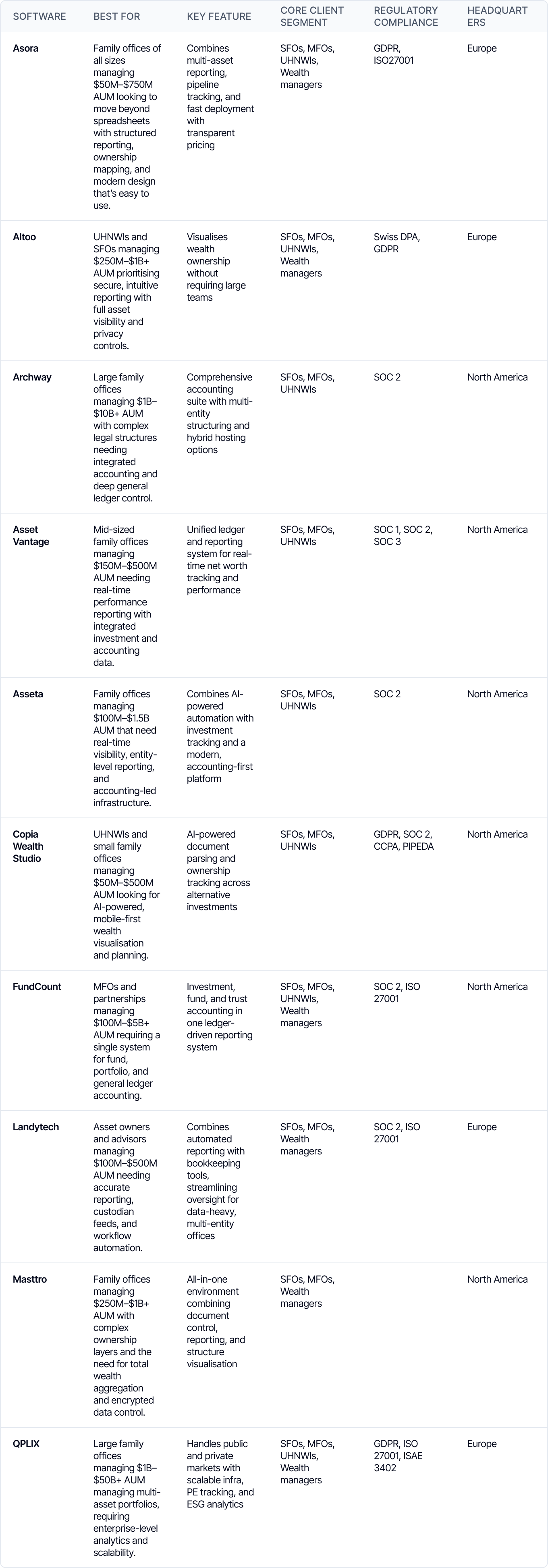 From performance reporting and multi-entity structuring to data aggregation and secure document management, the platforms featured in this list offer a range of capabilities to suit different needs and office models. While some focus on analytics and investment oversight, others combine reporting with operational infrastructure.