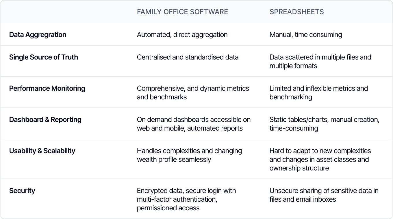 A family office should consider switching when spreadsheet complexity increases, reporting demands grow, or when errors and inefficiencies start affecting performance. If consolidating data across entities, assets, or custodians becomes a time drain, or if security and access control are concerns, purpose-built software offers a scalable and compliant solution.