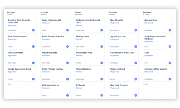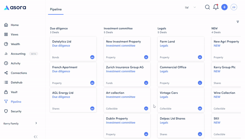 Asora includes pipeline tracking so you can follow assets or investments as they move through review, approval, or onboarding — all in one place.