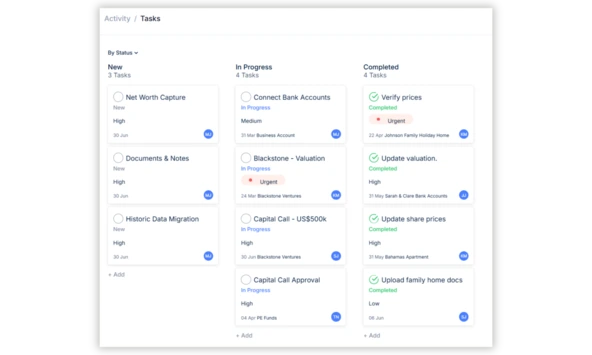 Tracking tasks, deadlines and documents across a family office is often scattered. Spreadsheets, calendar reminders and emails create silos, making it easy to miss something important.